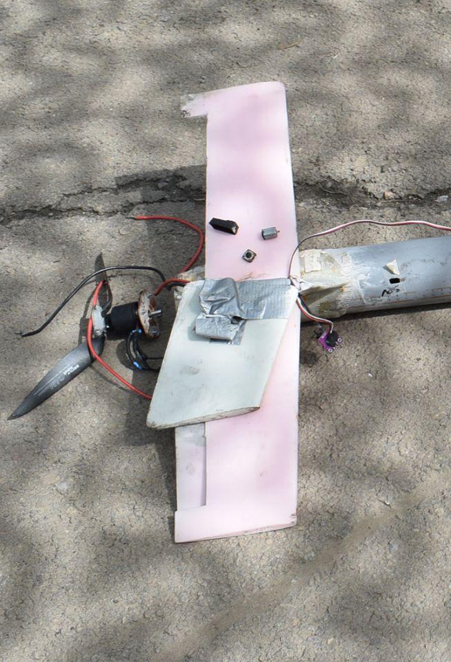 Беспилотный летательный аппарат произведен кустарным способом. Очевидно, чтобы избежать возможности его идентификации. БЛА собран на основе полипропиленовой трубы, где находилась капсула с боевым веществом и электродетонатором, приводимым в действие в результате столкновения БЛА с объектом.