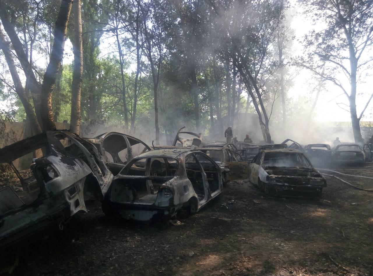В Голосеевском районе Киева на Столичном шоссе произошел масштабный пожар на штраф-площадке. По информации сотрудников ГСЧС, полностью выгорело 54 частных автомобиля.