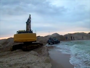 Водитель автомобиля "Subaru" хотел "проскочить" через канал, соединяющий лиман с Азовским морем. Автомобиль начало затягивать в воду. На помощь пришла техника, которая расчищает промоину. С помощью экскаватора машину вытащили на берег.