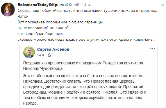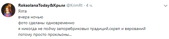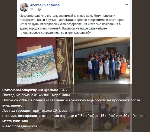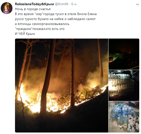 Крымский блогер RoksolanaToday&Крым освещает ситуацию в Ялте в своем Твиттере. Она сообщила, что вечером в субботу народ развлекался на концерте в честь дня города и любовался фейерверком, хотя в это время в горах зрелище было не менее "захватывающим".
