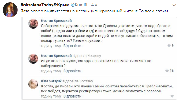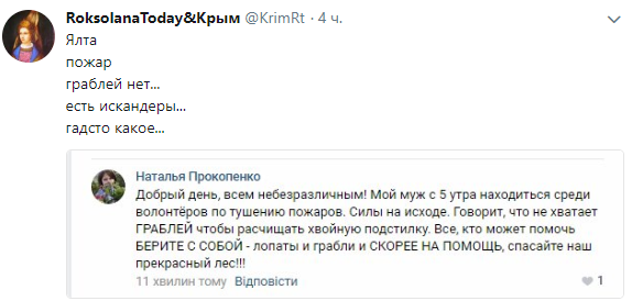 Неравнодушные жители Ялты организовали помощь пожарным едой и водой, некоторые волонтеры сами отправились помогать тушить огонь, поскольку людей и инструментов катастрофически не хватало.