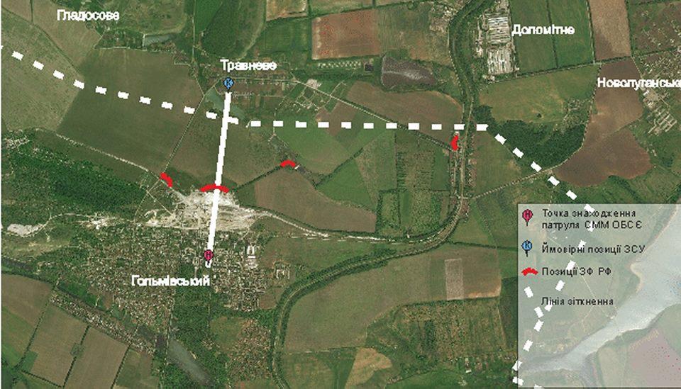 По результатам анализа местности, обстрел Вооруженными Силами Украины невозможен. Профиль высот участка местности и расстояние позиций Вооруженных Сил Украины от места нахождения патруля СММ ОБСЕ (более 2 км) не позволяют вести огонь. В свою очередь, по сообщению оперативного отчета СММ ОБСЕ, обстрел велся за 100-150 м к северу и северо-западу от места нахождения патруля Миссии - именно на этом расстоянии находятся позиции вооруженных формирований Российской Федерации.