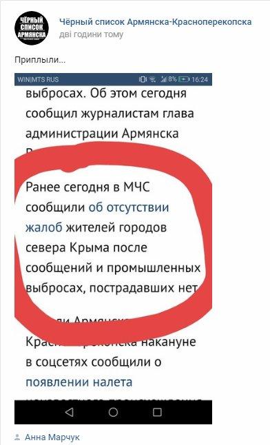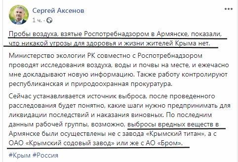Но я не про это.Про ВЫБРОСЫ.Не цитируйте брехню-это испарения кислоты из кислотоотстойника.Причина-РФ не решила проблему воды,жизненно важную для Крыма pic.twitter.com/QoqyVVP9dh— RoksolanaToday&Крым (@KrimRt) 29 августа 2018 г.