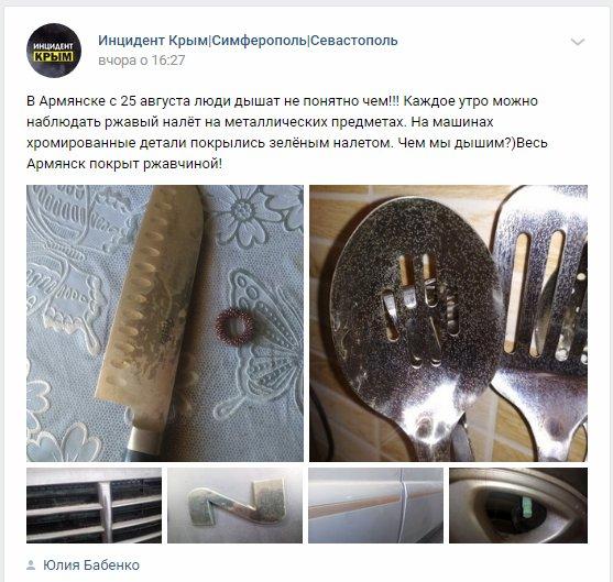 Жители Армянска выкладывают фото различных предметов, которые за одну ночь покрываются ржавчиной. Хромированные детали автомобилей зеленеют, а асфальт покрывается липким налетом.