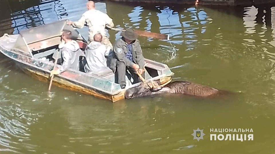 Рискуя жизнью, мужчины на лодке подплыли к животному без сознания и за рога вытащили лося на сушу.