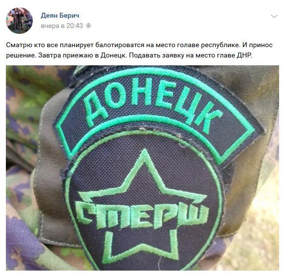 "Сматрю кто все планирует балотироватся на место голаве республике. И принос решение. Завтра приежаю в Донецк. Подавать заявку на место главе ДНР", - написал сербский боевик.