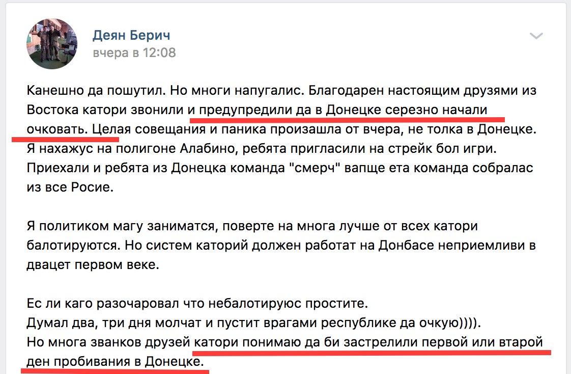 "Серб Берич, воевавший за ДНР, недавно написал, что будет участвовать в выборах главы ДНР. А сегодня пояснил, что не будет, потому что в Донецке его за это попросту убьют. Ну молодец серб. Вон какую замечательную республику отвоевал, где попытка участия в выборах карается смертью".