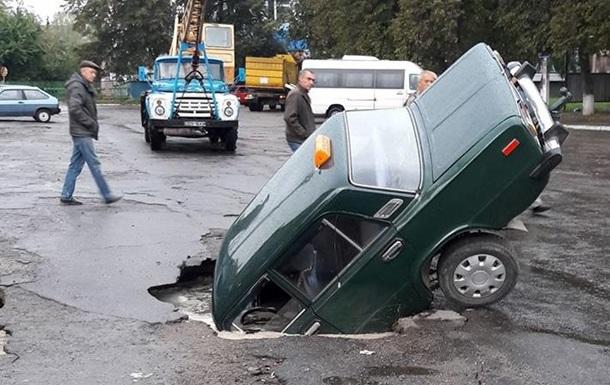 В Сквире Киевской области автомобиль провалился в яму на дороге.