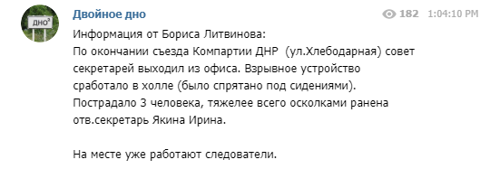 "На съезде компартии ДНР произошел взрыв. Есть пострадавшие", - сказано в посте.