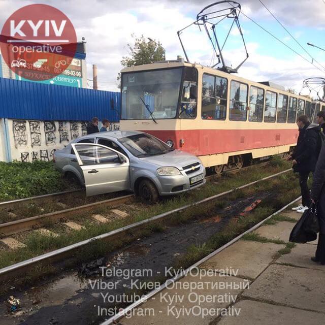 В украинской столице водитель Chevrolet на большой скорости выскочил на рельсы. В него въехал трамвай и протащил машину несколько метров.