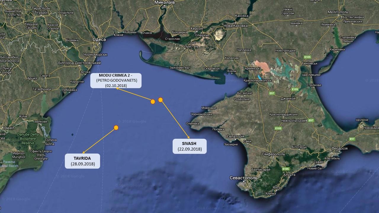Последние данные о работе установок зафиксированы техническими средствами осенью этого года, в частности активность плавучей буровой установки «Сиваш» 22 сентября 2018, «Таврида» 29 сентября 2018, «Петр Годованец» (переименована оккупационными властями на MODU Crimea 2) 2 октября 2018 г.