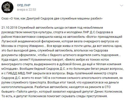 В районе пгт Новосветловка Сидоров на служебной машине Skoda Octavia столкнулся с "Волгой", принадлежащей Луганской филармонии. Сообщается, что последняя везла некоего российского артиста в сторону Изварино.