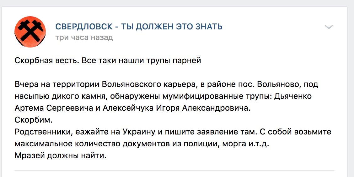 "Вчера на территории Вольяновского карьера, в районе пос. Вольяново, под насыпью дикого камня, обнаружены мумифицированные трупы: Дьяченко Артема Сергеевича и Алексейчука Игоря Александровича", - отмечается в группе "Свердловск - ты должен это знать".