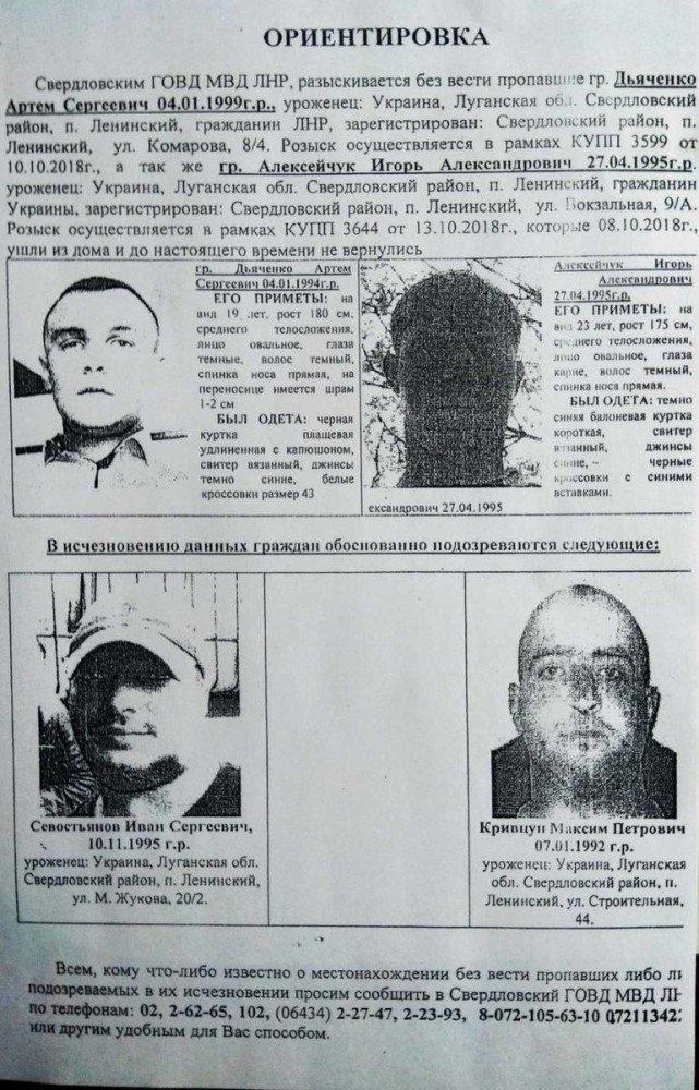 Парней разыскивало фейковое "МВД ЛНР". Как отмечается, Артем Дьяченко 1999 г.р. и Игорь Алексейчук 1995 г.р. ушли из дома 8 октября, и с тех пор не объявлялись.