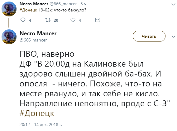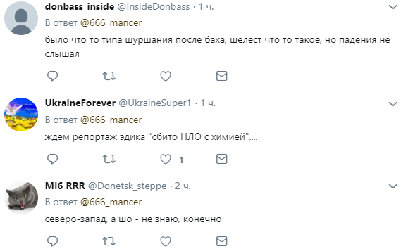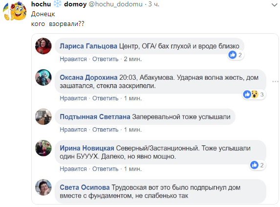 Как сообщается, двойной взрыв был слышен с северо-западного направления. Пользователи сети высказывают предположения, что отработало ПВО, либо был исходящий выстрел в сторону Марьинки. При этом дончане пишут, что звука падения не было слышно.