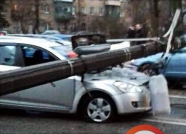 В Киеве на Куреневке на легковой автомобиль, который ехал по улице, упала электроопора.