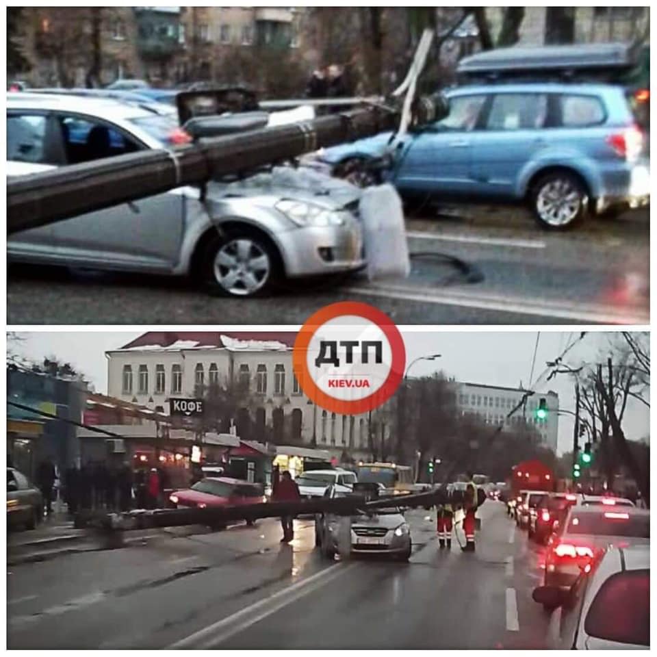 Происшествие случилось около Куреневского рынка. Столб упал на автомобиль KIA, никто не пострадал.