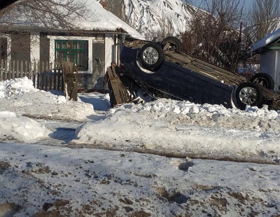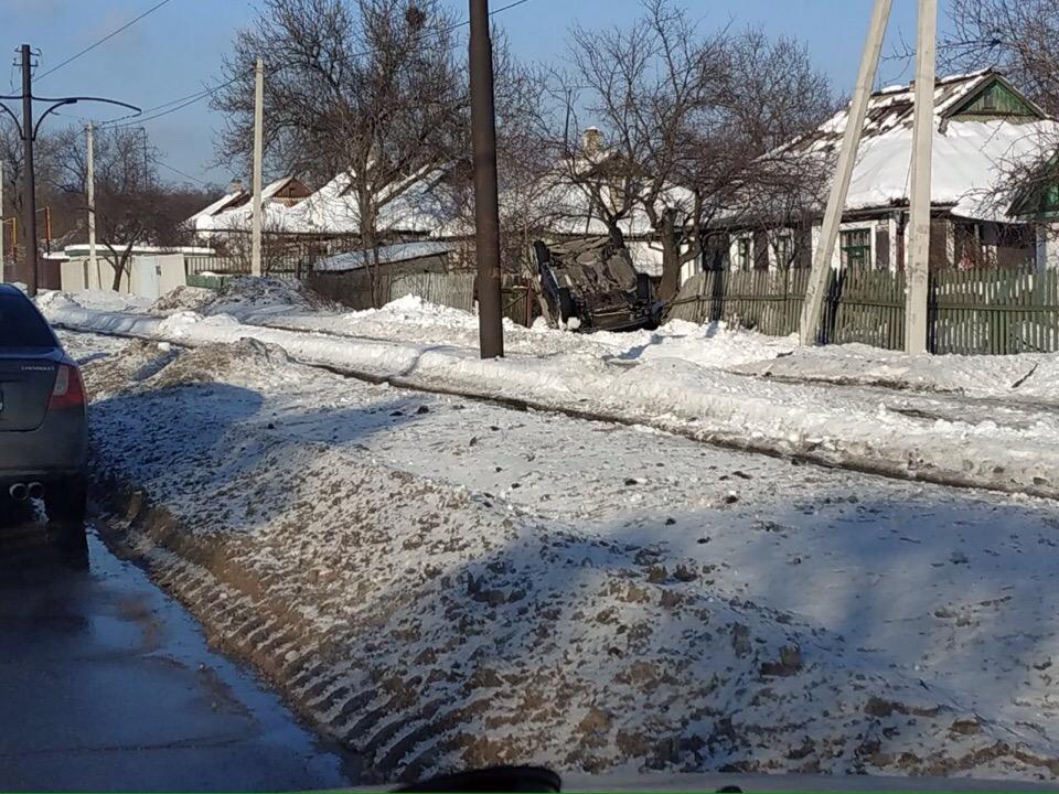 В оккупированном Донецке легковой автомобиль упал вверх колесами на забор частного подворья.
