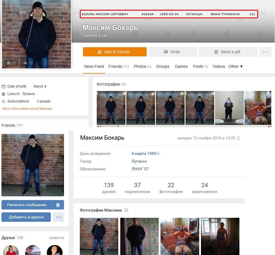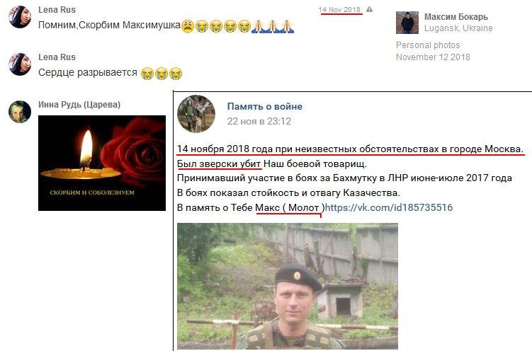 Как сообщается, боевик Бокарь Максим Сергеевич с позывным "Молот" (родился в Луганске 04/03/85 г.) был убит 14/11/18 г. в Москве при неизвестных обстоятельствах.