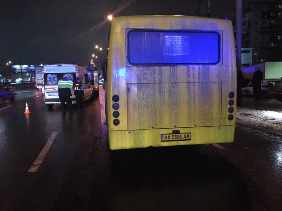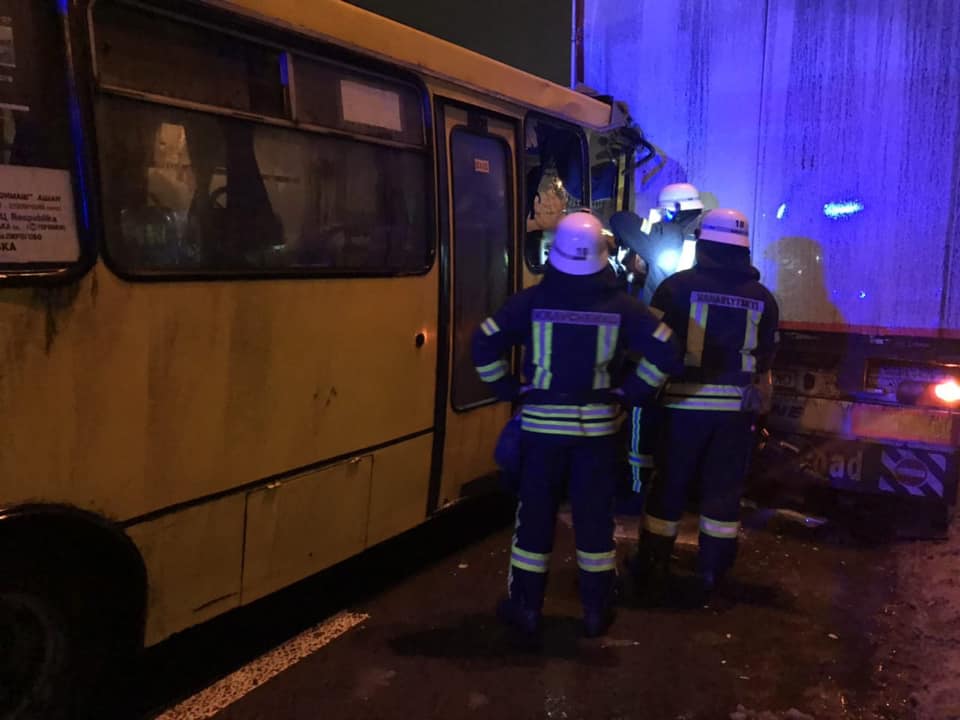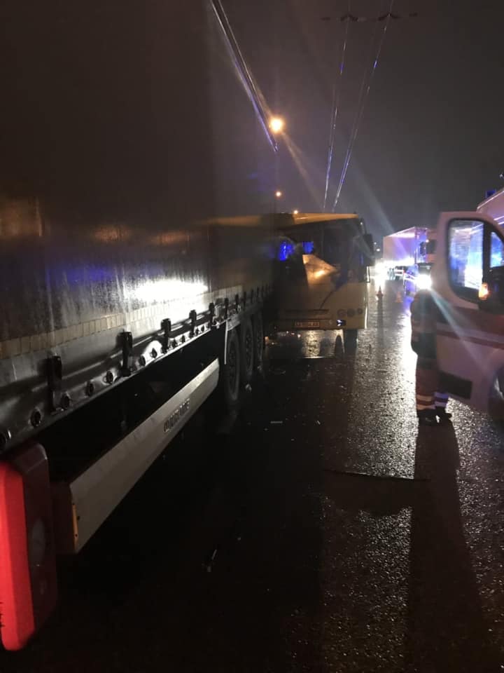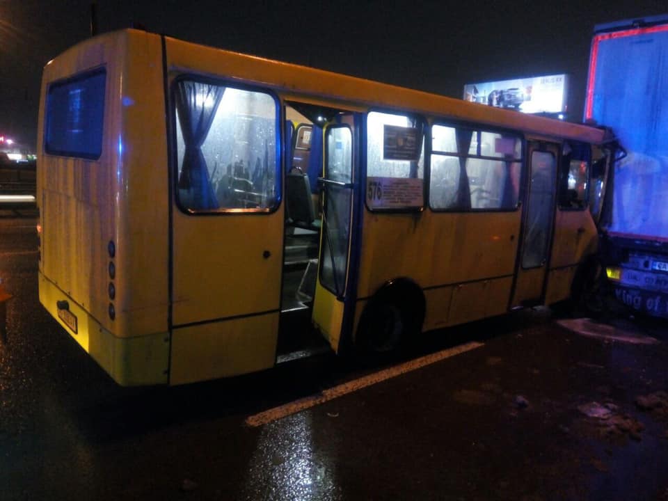 Сообщение об аварии с участием маршрутного автобуса и грузовика в Святошинском районе в дежурную часть поступило в 21.40. По предварительной информации, в результате столкновения травмы полчили восемь человек: водитель и пассажиры маршрутки. Семеро пострадавших получили нетяжелые травмы, а одному пассажиру зажало ноги, поэтому спасатели вырезали его с помощью специального оборудования (по информации врачей, у мужчины подозрение на перелом ноги). Всех доставили в больницу для осмотра.
