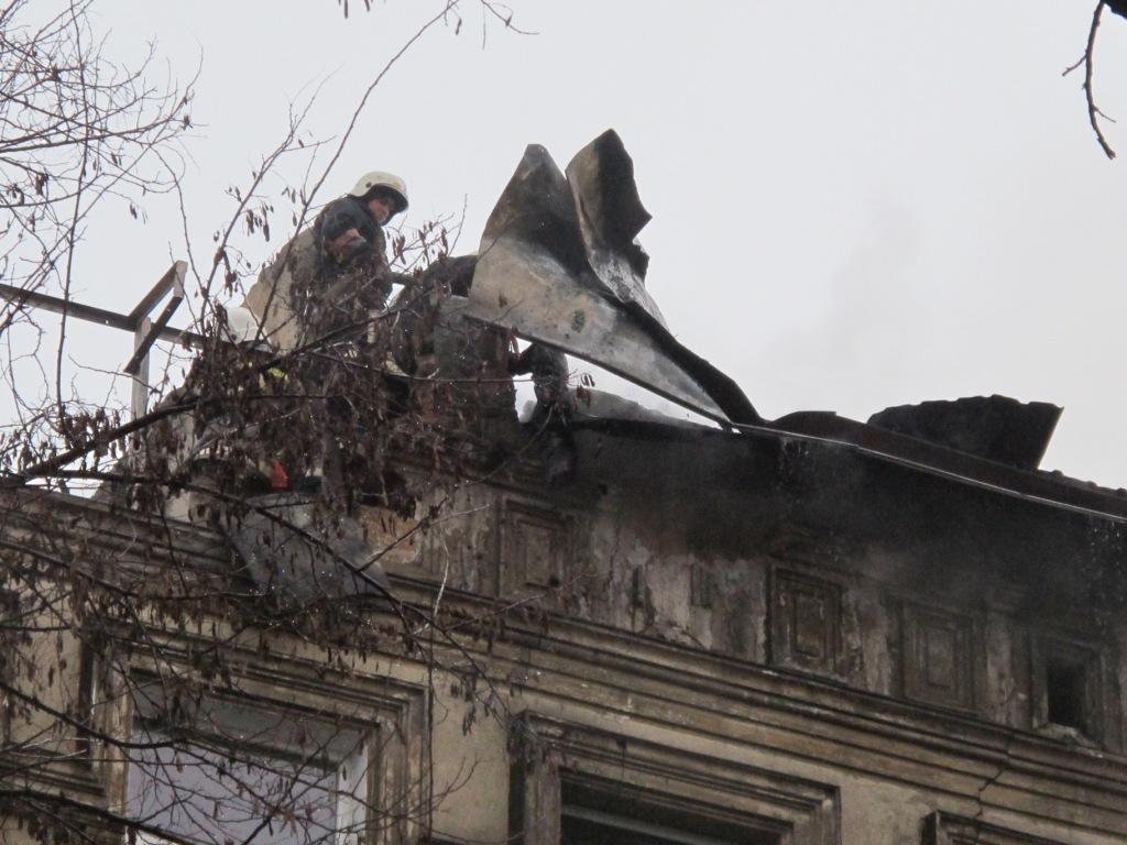 "По предварительным данным, возгорание произошло на чердаке четырехэтажного дома. Вследствие распространения огня взорвался вероятно газовый баллон, в результате чего был травмирован спасатель ГСЧС. Его доставили в больницу с ушибами плеча и ребер", - говорится в сообщении полиции.