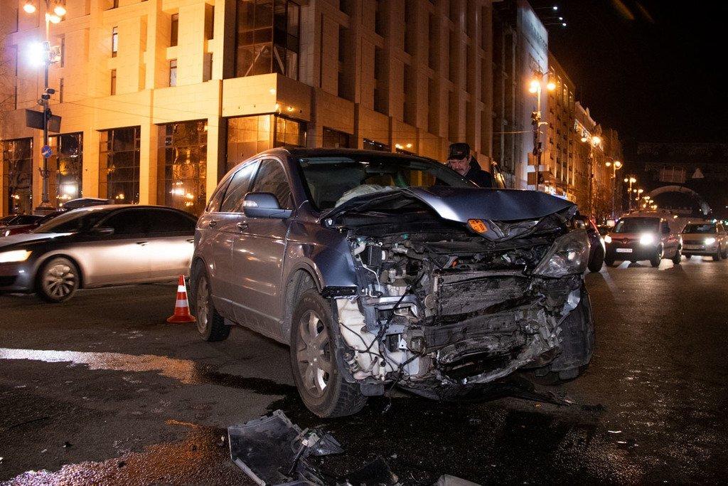 Очевидцы аварии сообщили, что автомобиль Honda CR-V выезжал на Крещатик со стороны Михайловской улицы. В него врезался белый седан Volkswagen, который проехал на красный свет светофора. После этого Volkswagen влетел в Citroen C3, который стоял на встречной полосе.