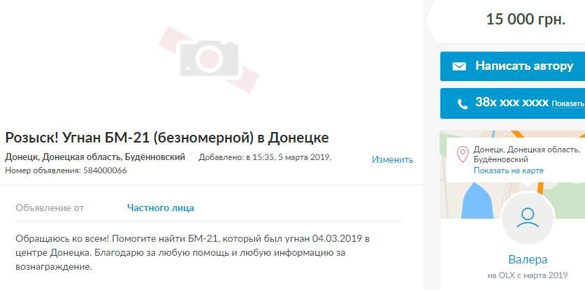 В оккупированном Донецке у боевиков "ДНР" угнали реактивную установку БМ-21 "Град". Пропавшую боевую машину ищут через сайт объявлений.