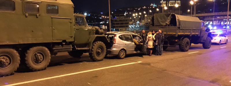 В Киеве на Гаванском мосту произошло ДТП, участниками которого стали военный грузовик и автомобиль Chevrolet. В салоне легковушки находились пожилой мужчина и ребенок.