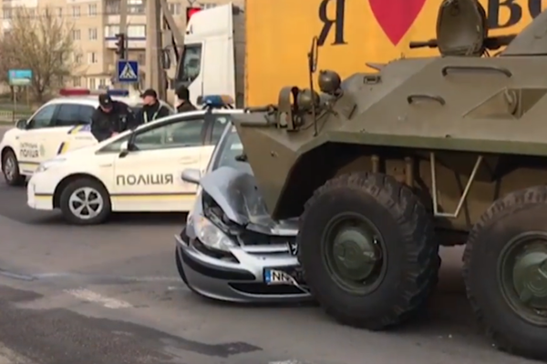 В городе Здолбунов Ровенской области произошло дорожно-транспортное происшествие с участием бронетранспортера и легкового автомобиля. Военная машина раздавила легковушку. Люди в аварии не пострадали.