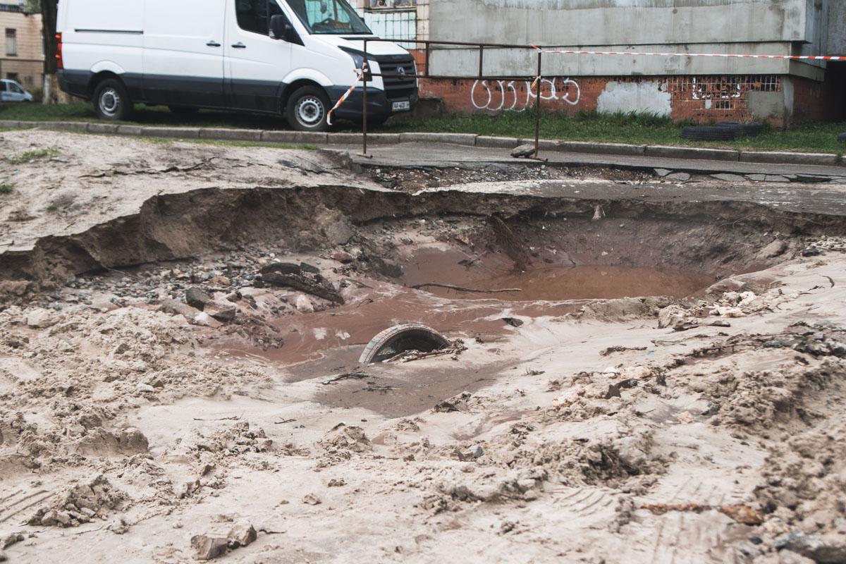 В Киеве на Борщаговке произошел порыв трубы горячего водоснабжения. Кипятком затопило детскую площадку и парковку. Один из автомобилей наполовину провалился под асфальт.