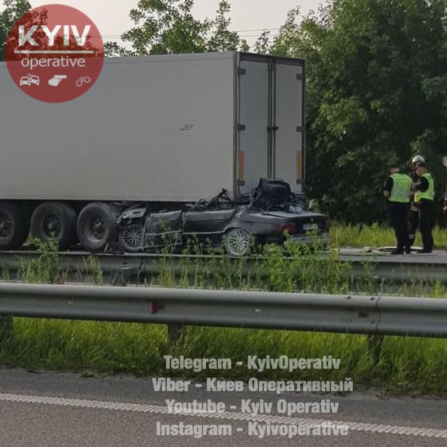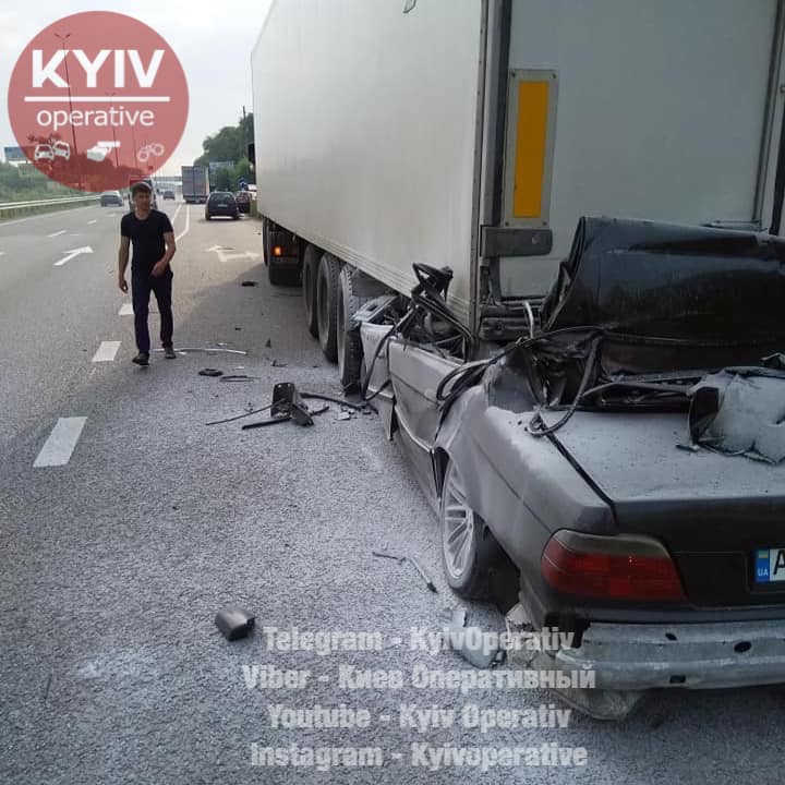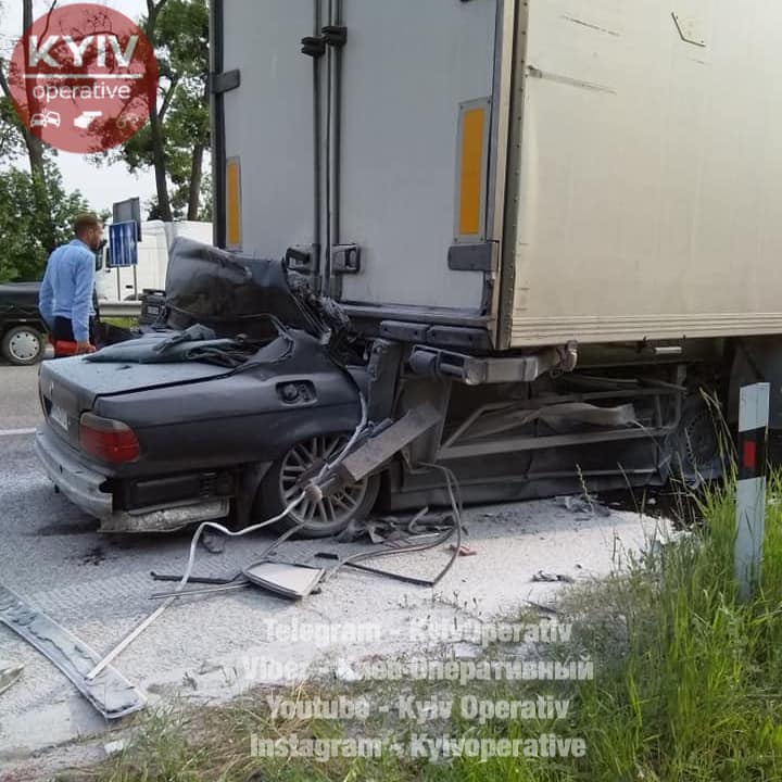 На Житомирской трассе в районе села Копылов Киевской области автомобиль BMW влетел под припаркованную фуру.
