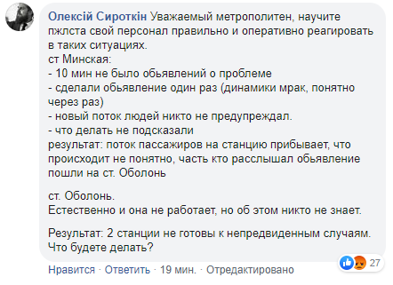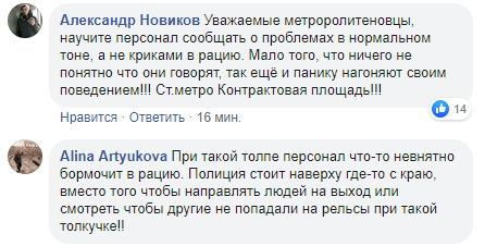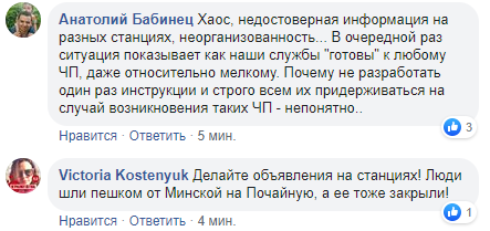 При этом на Фейсбук-странице КП "Киевский метрополитен" пользователи в комментариях жалуются на плохую организованность работы персонала в условиях ЧП.