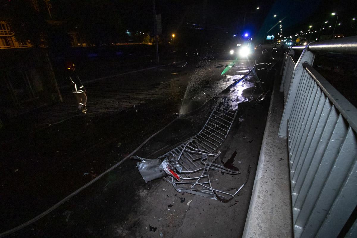 Отмечается, что по неизвестным причинам водитель потерял управление, когда фуга двигалась по эстакаде. Грузовик Volvo сбил два столба и отбойник, а после этого свалился с моста, вследствие чего перевернулся. К счастью, водитель авто остался жив.