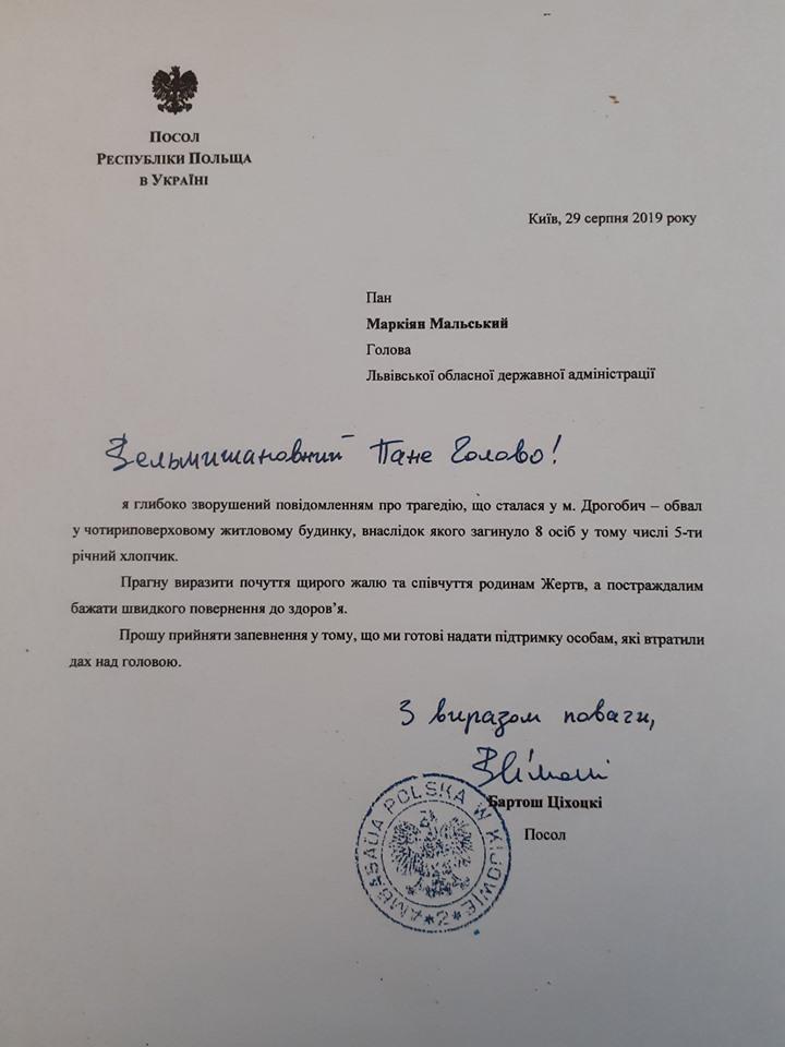 Согласно документу, посол Польши в Украине Бартош Цихоцки сперва заявил, что он был глубоко тронут сообщение о трагедии, которая произошла в Дрогобыче накануне.
