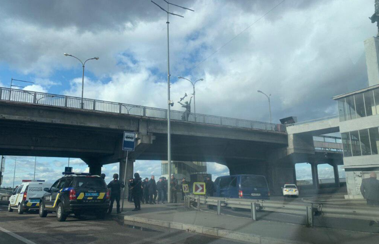 Перекритий міст Метро у Києві: у поліції повідомили, що чоловік, який погрожує підірвати міст, зробив кілька пострілів pic.twitter.com/mlWRFHph29