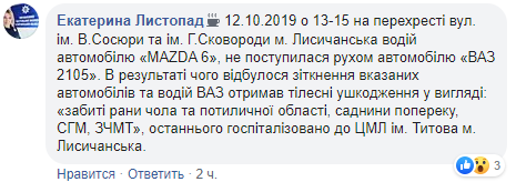 ДТП случилось в субботу, 12 октября, в 13:15 на перекрестке ул. им. В. Сосюры и им. Г. Сковороды. Водитель автомобиля "Mazda 6" не уступила дорогу автомобилю "ВАЗ 2105", в результате чего произошло столкновение указанных автомобилей.