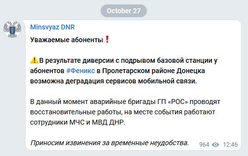 "В результате диверсии с подрывом базовой станции у абонентов "Феникс" в Пролетарском районе Донецка возможна деградация сервисов мобильной связи", - заявили в пресс-службе "минсвязи ДНР".