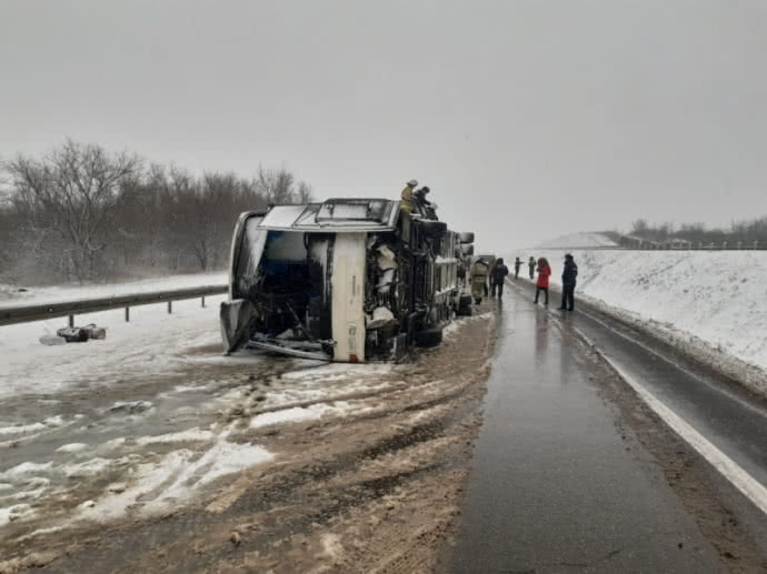 В Воронежской области России на скользкой заснеженной дороге перевернулся автобус сообщением Запорожье-Ростов.