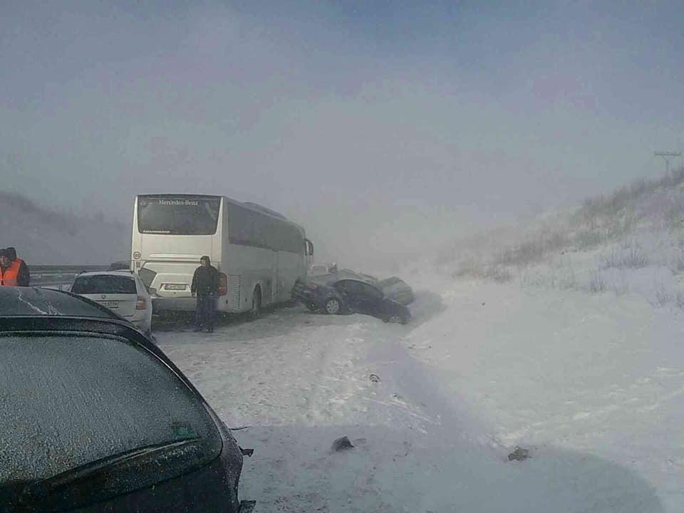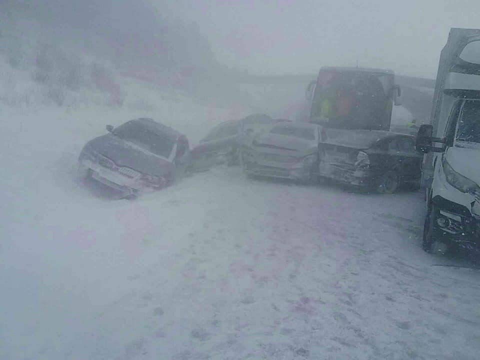 В словацких Татрах на заснеженной дороге столкнулись 20 транспортных средств - 17 автомобилей, 2 микроавтобуса и 1 автобус.