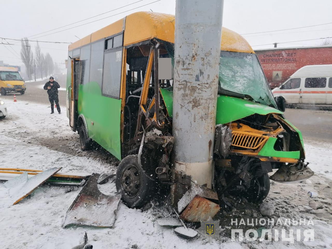 В городе Сумы произошло дорожно-транспортное происшествие, в котором пострадали десять человек. Маршрутный автобус с людьми врезался в опору электросети.