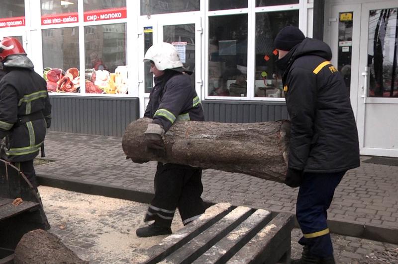 На Хмельниччине местные жители также обращаются к сотрудникам ГСЧС с просьбами убрать поваленные деревья. Так, в областном центре возле магазина упала ель и повредила фасад, никто из людей не пострадал.