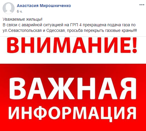 "Уважаемые жильцы! В связи с аварийной ситуацией на ГРП 4 прекращена подача газа по ул.Севастопольская и Одесская, просьба перекрыть газовые краны!" - было сказано в посте.