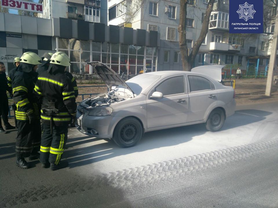 В Северодонецке на перекрестке неожиданно загорелся автомобиль Chevrolet Aveo, оборудованный газовой установкой. На помощь водителю бросились сотрудники патрульной полиции и проезжающие мимо водители.