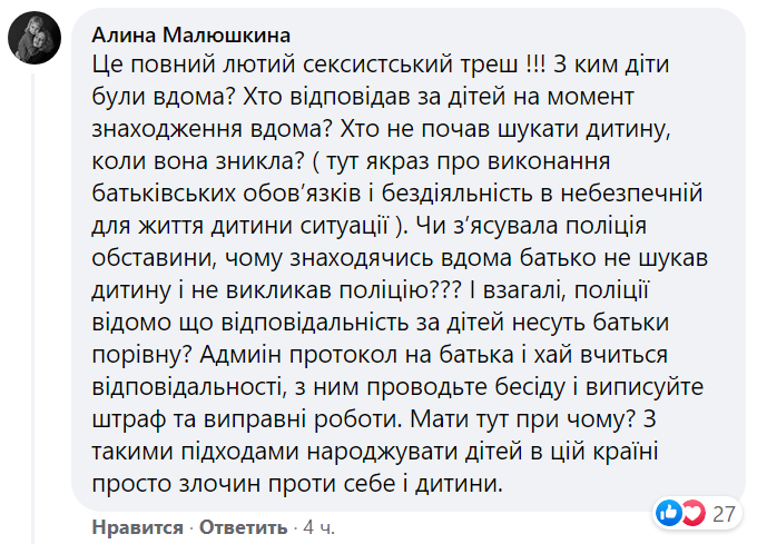 Под соответствующим постом на странице полиции Киева в Фейсбуке уже более 2000 комментариев. Действия полиции вызвали у граждан вопросы: в частности, почему протокол составили только на маму и с ней же провели профилактическую беседу, если за ребенком не уследил отец? По мнению украинцев, данный инцидент ретранслирует установку, будто вся ответственность за воспитание детей лежит на женщине, а с мужчины "взятки гладки". Также в действиях полиции увидели унижение мужчин и доказательство гендерного неравноправия в обществе.