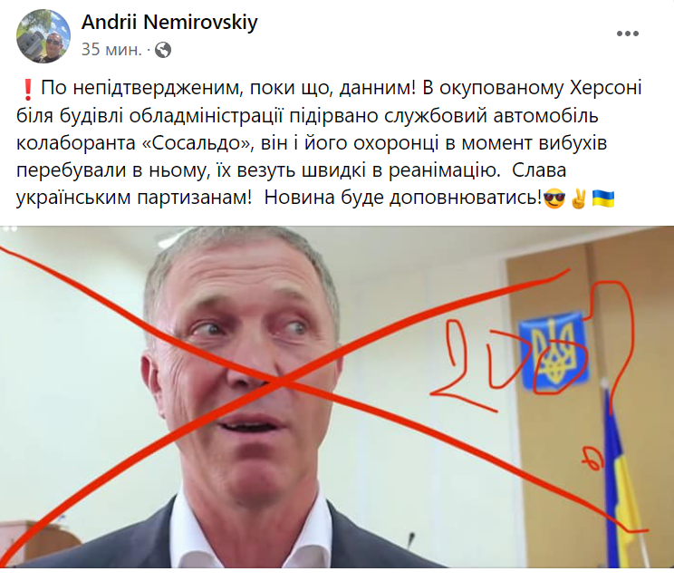 Он сообщил, что в оккупированном Херсоне возле здания обладминистрации взорван служебный автомобиль Сальдо, он и его охранники в момент взрывов находились в нем, их увезли "скорые" в реанимацию.