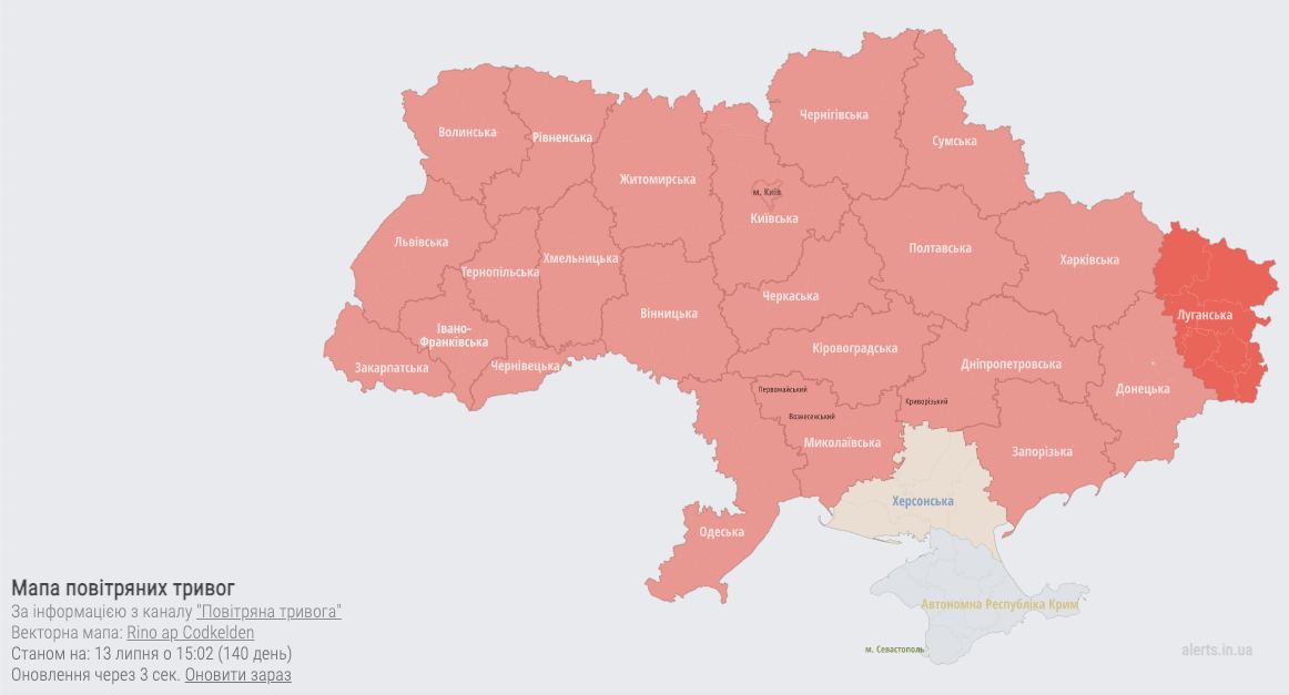 В настоящее время воздушная тревога объявлена по всей территории Украины, кроме оккупированных Херсонской области и Крыма.