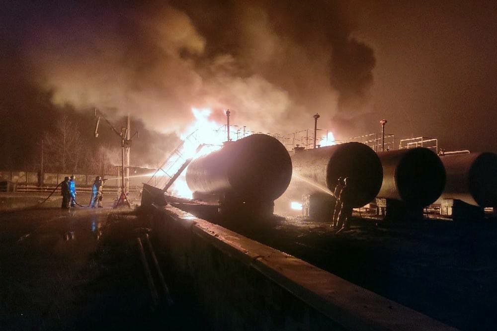 Оккупационное "МЧС" сообщило о горении 2 цистерн с топливом объемом 70 м куб. на ж/д полотне за территорией нефтебазы, а также горении 3 стационарных емкостей в одном обваловании объемом 60 м куб., находящихся в 20-25 м от ж/д полотна.