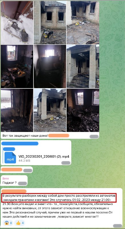 На совет администратора чата писать обращения в военную прокуратуру женщина отвечает: "Да как вы не понимаете, люди боятся гранаты во двор. Я вызывала полицию, приехали, спасибо. Написала заявление, а мои родные сказали, что не надо, спалят дом. Пусть хоть стены останутся. Да, вот так, вынесли все, что смогли. Разгромили, так пусть хоть стены останутся".