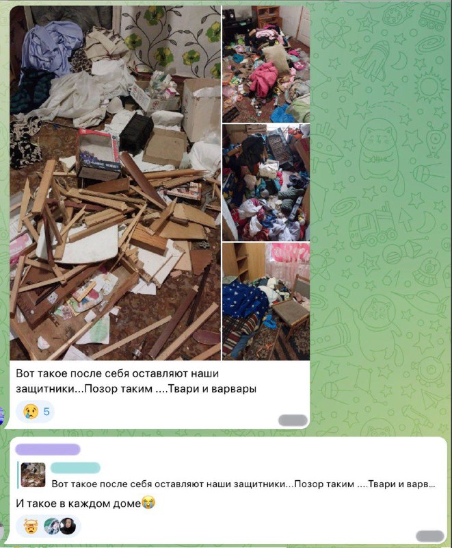 "Вот такое после себя оставляют наши защитники… Позор таким. Люди выехали… За домом присматриваю… Пришлось со скандалом выдворить, слов нет! И такое в каждом доме. Трижды взламывали, наверное, в надежде что-то найти. Мебель испортили, присутствует воровство смешных вещей, двери испортили, жесть короче", - пишет местная жительница.