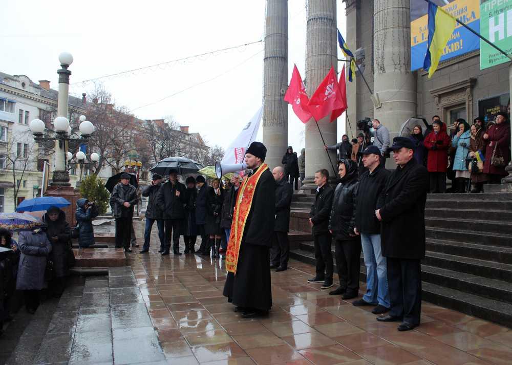 «Я вспоминаю первое вече на Театральной площади 23 ноября прошлого года. Сессия городского совета тогда первой среди городских советов Украины вышла со своей многотысячной общиной на вече с призывом о поддержке евроинтеграции. Тогда никто не мог представить, как будут разворачиваться события в течение следующих трех месяцев.